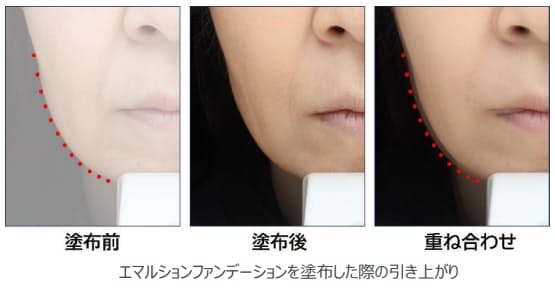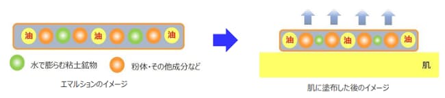 塗布直後に肌表面をリフトアップさせる技術は、水中油型(O/W型)のエマルションに、水分で膨らむ性質を持つ粘土鉱物と水溶性セルロース誘導体を配合することによって生まれます。肌に塗布した後に水分蒸散することで、粘土鉱物と水溶性セルロース誘導体が肌にピタッと密着し、皮膜を形成することによって肌に引き上げ感を演出するメカニズムです。当社は、これまで、ファンデーションなどのベースメイク品でもスキンケア成分を配合しやすい水中油型(O/W型)の処方にこだわって研究をしてきたため、この技術にたどり着いたと言えます。なお、この技術はエマルションタイプのファンデーションだけでなく、エマルションタイプのスキンケア品に配合しても同様の効果が得られると考えますが、内容物を肌から落とすことで引き上がり感の効果はなくなります。
